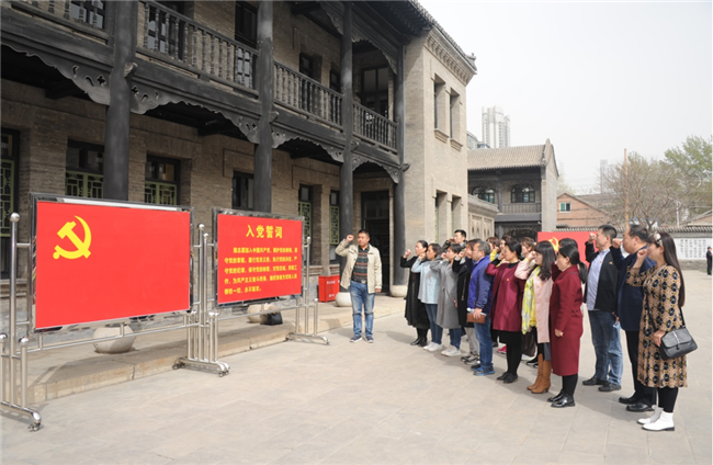 在山西省立国民师范学校办公楼旧址前,全体党员面向党旗,举起右手,重温入党誓词,立下对党忠诚的誓言。