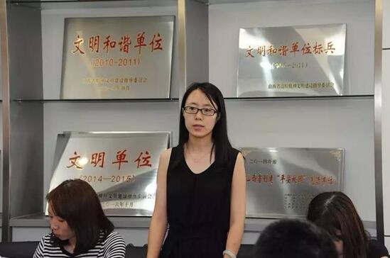 高俊怡老师代表全体拟聘班主任发言,她表示会虚心学习,转变思想定位,将学生工作做实、做好。
