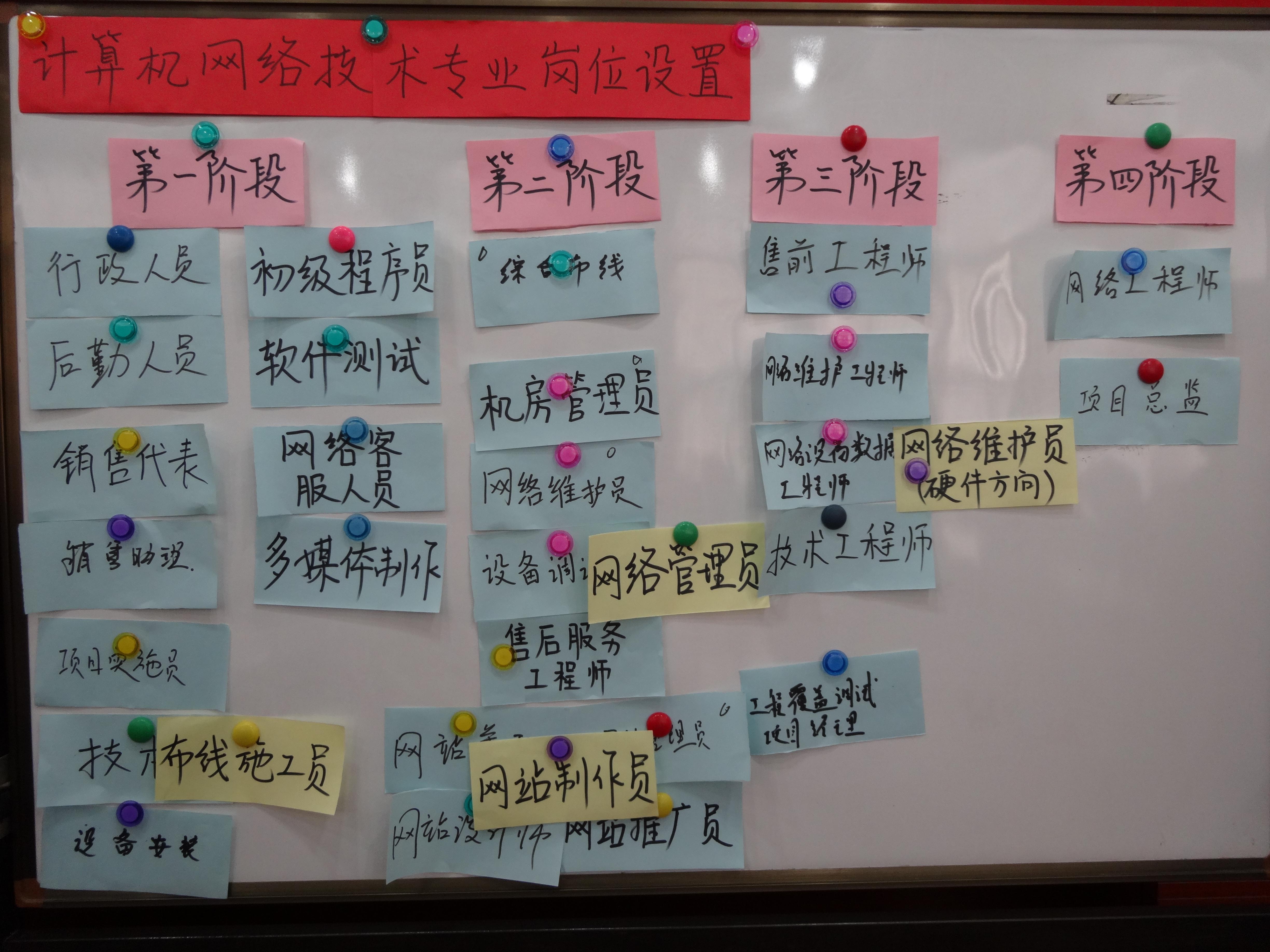 计算机专业科主任朱老师向各位专家介绍了我校的基本情况以及此次访谈会的背景和目的。访谈会分为五个阶段进行。第一阶段与会实践专家填写、简述和讨论《企业技能人才职业发展历程自我分析表》,朱老师为专家颁发兼职教师证书。第二阶段由专家列举出与专业相关的毕业生的职业岗位及每个岗位的工作任务;第三阶段常老师按照职业发展的阶段,将工作岗位、工作任务一一筛选,归类。第四阶段对分类归档的工作任务进行总结,通过集体研讨提炼出该职业领域的典型工作任务。第五阶段由专家与专业教师组成小组,对每个典型工作任务分别从工作与经营过程、工作岗位、工作对象、工作方法、对工作的要求、综合性问题等要点进行了分析归纳。最终,与会专家和教师共同总结和提炼出反映典型工作任务的鱼骨图。
