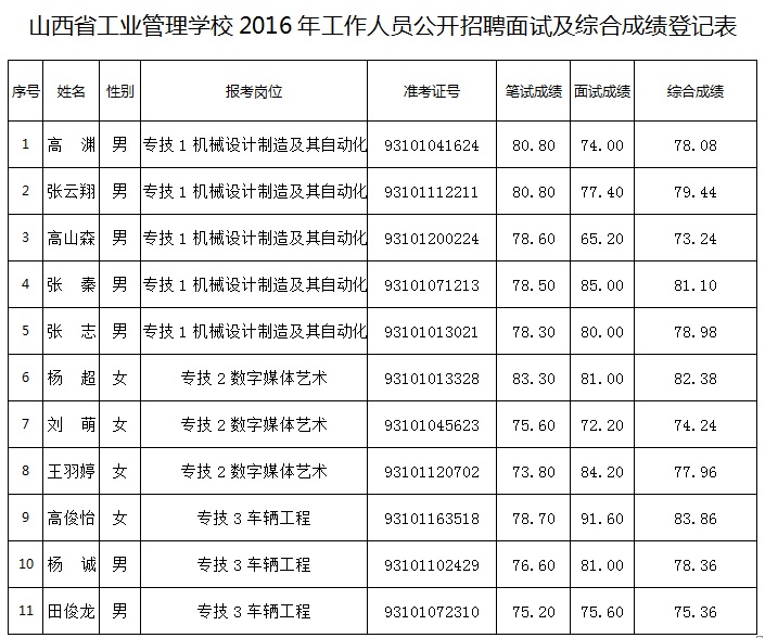根据《山西省古交市职业中学2016年工作人员公开招聘公告》规定的程序,在山西省人社厅、教育厅的指导下和我校纪检监察室全程监督下,我校于2016年9月4日对资格复审通过的应聘人员进行了面试,招聘考试工作已全部结束,现将面试成绩及总成绩予以公示(见下表)。
